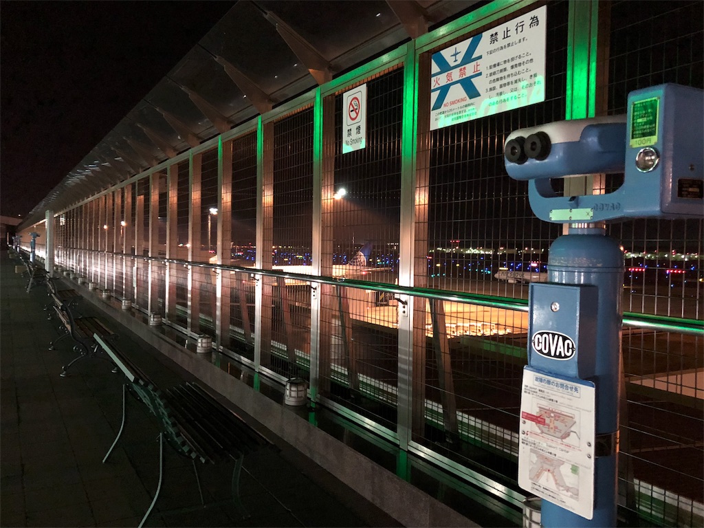 夜の空港の展望デッキは、静かなことが多いです。ひんやりとした空気を吸って、駐機場の夜景を眺めていると、活力を得られるというか、「これからがんばるぞ!」という気持ちになります。